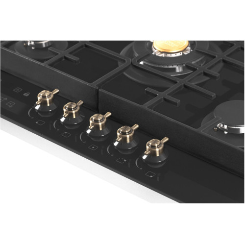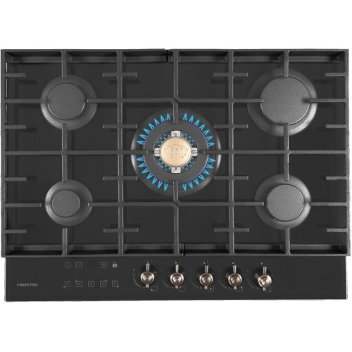 Встраиваемая газовая варочная поверхность HIBERG VM 7155 B из закаленного стекла в черном цвете, оснащена 5 конфорками и функциями: автоматический «электророзжиг», «газ-контроль» и сенсорный таймер отключения. В комплект варочной поверхности входит дополнительный набор ручек регуляторов в ретро-стиле. Рабочая поверхность выполнена из закаленного стекла – прочного и долговечного материала, на ней располагаются 5 конфорок разных по диаметру и мощности огня. WOK конфорка мощностью 3,4 кВт позволяет ускорить закипание воды и использовать интенсивную скорость прожарки. Мощность любой горелки можно регулировать с помощью поворотных переключателей. Для удобства пользования варочной панелью в переключатели встроен «электророзжиг», который позволит одним нажатием руки легко включить нужную конфорку без использования спичек. В варочной поверхности эффективно продумана система безопасности при утечке газа. В случае пролива жидкости на варочную панель или затухания пламени от сквозняка, в конфорке срабатывает функция газ-контроль и подача газа прекращается. Сенсорный индивидуальный таймер для каждой конфорки дает возможность контролировать время готовки каждого блюда. Таймер устанавливается с диапазоном от 1 до 99 минут, по истечении заданного времени варочная панель отключается автоматически. Поверх конфорок установлены чугунные решетки новой конструкции: соприкасаясь со стеклянной панелью только спереди и сзади, обеспечивают меньшую нагрузку на стекло и не оставляют царапин. Кроме того, такие держатели легкие по весу, удобные в уходе и использовании любой посуды на варочной поверхности. Особенности и преимущества: * поверхность из закаленного стекла; * электророзжиг; * газ-контроль; * сенсорный таймер; * WOK конфорка; * чугунные решетки; * 2 комплекта ручек.
