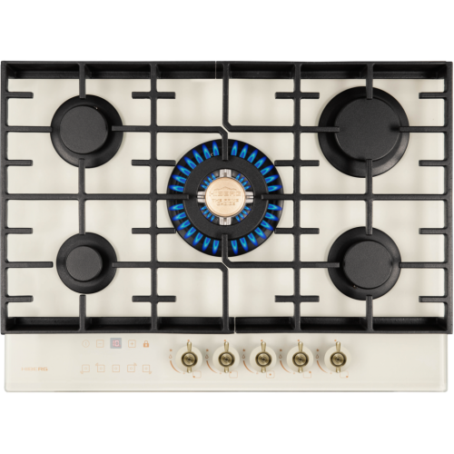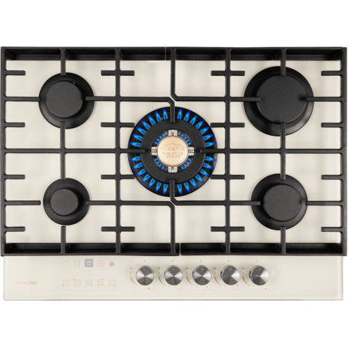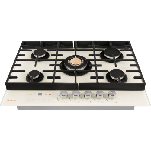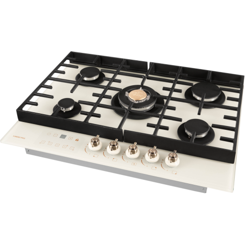 Описание Встраиваемая газовая варочная поверхность HIBERG VM 7155 из закаленного стекла в ретро-стиле, оснащена 5 конфорками и функциями: автоматический «электророзжиг», «газ-контроль» и сенсорный таймер отключения. В комплект варочной поверхности входит дополнительный набор ручек регуляторов в современном стиле Рабочая поверхность выполнена из закаленного стекла – прочного и долговечного материала, на ней располагаются 5 конфорок разных по диаметру и мощности огня. WOK конфорка мощностью 3,4 кВт позволяет ускорить закипание воды и использовать интенсивную скорость прожарки. Мощность любой горелки можно регулировать с помощью поворотных переключателей. Для удобства пользования варочной панелью в переключатели встроен «электророзжиг», который позволит одним нажатием руки легко включить нужную конфорку без использования спичек. В варочной поверхности эффективно продумана система безопасности при утечке газа. В случае пролива жидкости на варочную панель или затухания пламени от сквозняка, в конфорке срабатывает функция газ-контроль и подача газа прекращается. Сенсорный индивидуальный таймер для каждой конфорки дает возможность контролировать время готовки каждого блюда. Таймер устанавливается с диапазоном от 1 до 99 минут, по истечении заданного времени варочная панель отключается автоматически. Поверх конфорок установлены чугунные решетки новой конструкции: соприкасаясь со стеклянной панелью только спереди и сзади, обеспечивают меньшую нагрузку на стекло и не оставляют царапин. Кроме того, такие держатели легкие по весу, удобные в уходе и использовании любой посуды на варочной поверхности. Особенности и преимущества: поверхность из закаленного стекла; электророзжиг; газ-контроль; сенсорный таймер; WOK конфорка; чугунные решетки. Гарантия на варочную поверхность HIBERG – 2 года.
