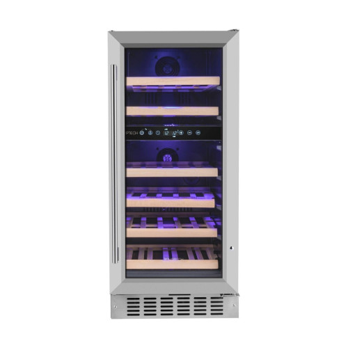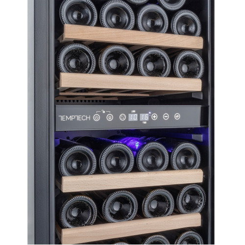 Винный шкаф Temptech SOMX15SRB предназначен для охлаждения, хранения и демонстрации бутилированного вина. Модель оснащена сенсорной панелью с дисплеем для регулировки температуры и освещения, 6 выдвижными полками, фильтром с активированным углем и синей светодиодной подсветкой. Дверца выполнена из двухслойного стекла с защитой от УФ-лучей, передняя панель - из нержавеющей стали, полки - из бука. Особенности: * Независимая регулировка температуры в каждой зоне * Оптимальная влажность * Стабильная температура * Вентиляторы, обеспечивающие циркуляцию воздуха * Бесшумный компрессор * Специально разработанные ножки - гасители вибрации * Встраивается под столешницу или устанавливается как отдельностоящий * Хладагент: R600a * Энергетический класс: G * Сертифицировано RoHs, CE, CB, ERP