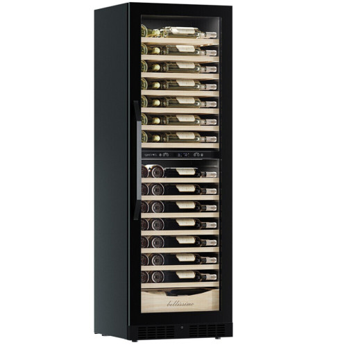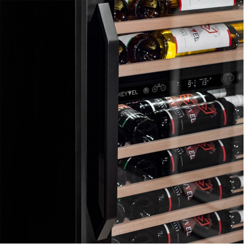 Винный шкаф предназначен для профессионального и длительного хранения различных сортов вин (до 110 бутылок типа Бордо). Он так же оснащен дверью с защитой от ультрафиолетовых лучей и поддерживает влажность в диапазоне 60-80%, как в настоящем винном погребе. Шкаф сочетает в себе неподвластное времени очарование, а так же качество натуральных материалов и высоких технологий. Главным преимуществом этой модели являются её небольшие размеры. Обычно винные шкафы больших размеров имеют глубину около 70 см, но у этой модели она всего 55 см. Именно поэтому данная модель идеально вписывается в кухню любых размеров. Так же он отлично подойдёт и для ресторанов. MV110-KBT2(Slim) может устанавливаться как отдельно, так и встраиваться в нишу. За счёт того, что верхняя петля двери не выступает за пределы корпуса и шкаф оснащён встроенной системой вентиляции- эта модель устанавливается в нишу с минимальными зазорами.