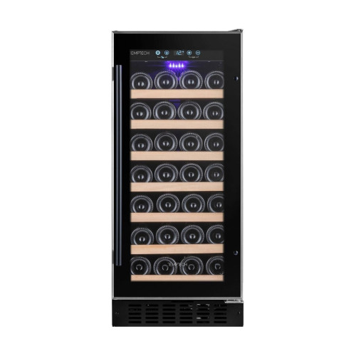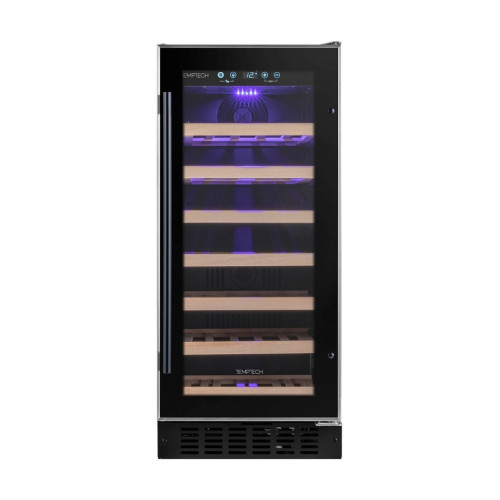 Винный шкаф Temptech Premium WPQ38SCB предназначен для охлаждения, хранения и демонстрации бутилированного вина. Модель оснащена сенсорной панелью с дисплеем для регулировки температуры и освещения, 7 выдвижными полками, фильтром с активированным углем и синей светодиодной подсветкой. Дверца выполнена из двухслойного стекла с защитой от УФ-лучей, передняя панель - из черного стекла, полки - из бука. Особенности: * Оптимальная влажность * Стабильная температура * Вентиляторы, обеспечивающие циркуляцию воздуха * Бесшумный компрессор * Специально разработанные ножки - гасители вибрации * Встраивается под столешницу или устанавливается как отдельностоящий * Хладагент: R600a * Энергетический класс: G * Сертифицировано RoHs, CE, CB, ERP