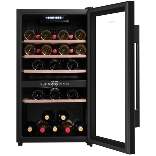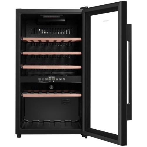 Винный шкаф с двумя температурными зонами и общей вместимостью до 49 бутылок. Современный винный шкаф MFWC-124D49 – инновационное решение проблемы качественного хранения вина. Расширенная функциональность, изысканный дизайн, полноценная имитация условий «винного погреба» – всё это винный шкаф MFWC-124D49. В нем можно хранить до 49 бутылок при температуре от 5 ° C до 22 ° C. Напитки нужной температуры, всегда готовые к подаче. Храните самые разнообразные сорта вин Широкий температурный диапазон винного шкафа (от 5 ° C до 22 ° C) позволит хранить красные, белые и игристые вина, а также подготавливать их к подаче. Винный шкаф MFWC-124D49 в полной мере обеспечивает сохранность вина при правильной температуре, позволяет напитку дозревать, раскрывая его вкус и аромат. Шкаф имеет две зоны, для каждой из них можно задать свой режим охлаждения — это актуально для тех, кто планирует хранить дома разные виды напитка: красное, белое, шампанское. Продуманное внутреннее пространство Внутреннее пространство рассчитано на хранение до 49 бутылок. При желании можно извлечь полку и разместить большее количество бутылок. Для размещения винных бутылок, шкаф оснащен 4 крепкими полками из массива бука. Универсальный винный шкаф для любого интерьера Изысканный дизайн модели делает её абсолютным выбором большинства: корпус выполнен из металла, окрашенной в чёрный цвет. Современная технология освещения зоны позволит вам в любое время эффектно продемонстрировать вашу винную коллекцию гостям. Каждая деталь модели гармонично дополняет друг друга, делая винный шкаф универсальным под любые стили интерьера. Дверца шкафа выполнена из тонированного стекла с защитой от УФ лучей. Сенсорная панель управления Управляйте всеми функциями винного шкафа с помощью интуитивно-понятной сенсорной панели управления одним касанием пальца. Эффективная циркуляция воздуха Шкаф оснащён внутренним вентилятором для равномерного распределения холодного воздуха ко всем полкам шкафа. Преимущества винного шкафа вместительность до 49 бутылок; изысканный дизайн; равномерное охлаждение и качественная циркуляция воздуха; защита от УФ-излучения с помощью тонированного стекла; мягкая светодиодная подсветка; сенсорное управление; простая система настройки уровня температуры 2 зоны с настраиваемой температурой