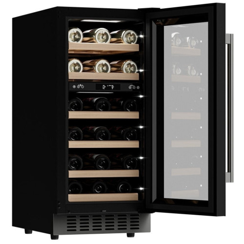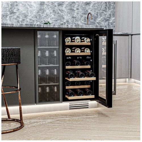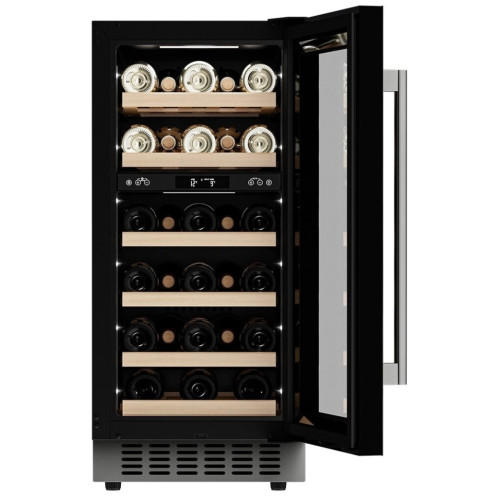 тип винного шкафа: двухтемпературный, высота: 82 см, ширина: 38 см, глубина: 57.80 см, емкость винного шкафа, бут.: 28, количество камер: 2, класс энергопотребления: A, цвет корпуса: чёрный