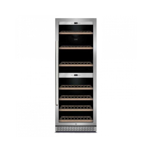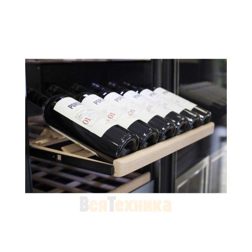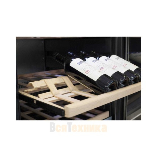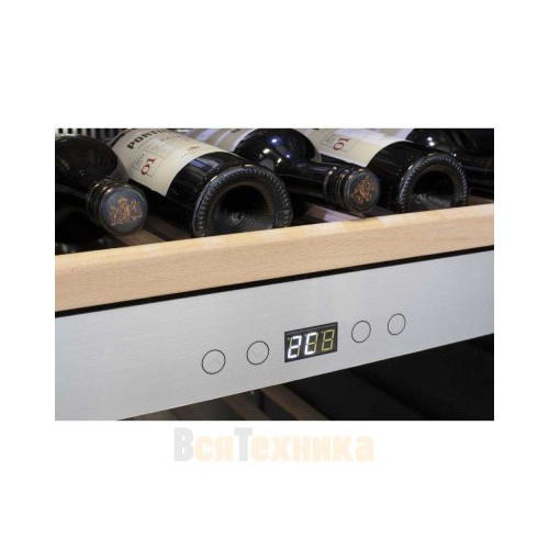 Семь съемных полок из дерева предназначены для правильного хранения вина: бутылки кладутся горизонтально (вместительность – 126 бутылок). Деревянные полки оборудованы фиксаторами от самопроизвольного выдвижения и компенсируют механические воздействия компрессора и вентилятора. Благодаря функции WiFi Smart Control, через мобильное приложение CASO-APP, можно удаленно следить за параметрами вашего винного шкафа и менять их в случае необходимости. Управление осуществляется при помощи двух сенсорных панелей. Регулировка температурных показателей с шагом в 1°C происходит нажатием « ∧ » и «∨». Управление внутренним освещением возможно при помощи кнопки «Свет». Чтобы прочитать этикетку, не нужно открывать дверь холодильника — светодиодные панели включаются кнопкой на внешней панели управления.