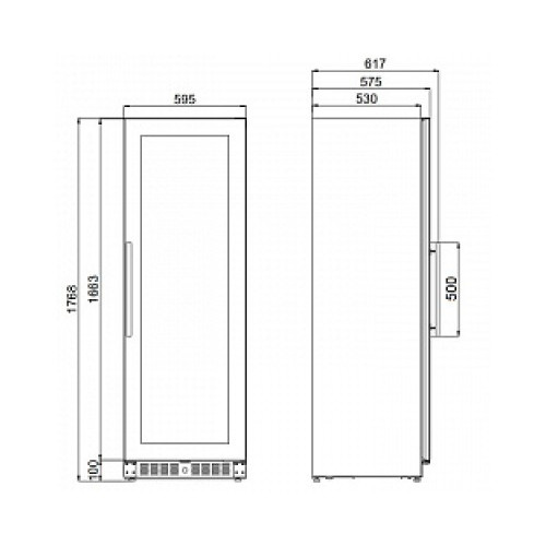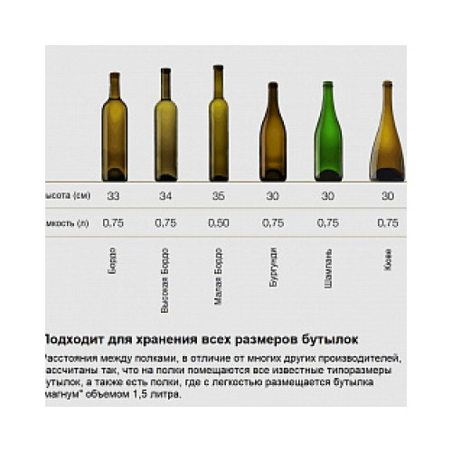 | Дополнительные особенности | Подходит для ресторана/Возможность встраивания: В колонну/Стандартная комплектация: Резервуар для воды/2 ключа/ярлыки для записей даты закладки вина/Индикация температуры/Индикатор открытой двери/Выдвижной ящик для хранения открытых бутылок с вином/также для размещения магнумов/хьюмидоров/шоколада/Функция памяти установленного режима охлаждения (при отключении электропитания заданный режим сохраняется)/Белая внутренняя подсветка с двух сторон/Регулировка высоты за счет выкручивания ножек до 8 см/Ручка и накладки на полках из стали/Задняя стенка винного шкафа абсолютно плоская (можно ставить вплотную к стене)/Максимальная закладка до 155 бутылок (при демонтаже нескольких полок) |