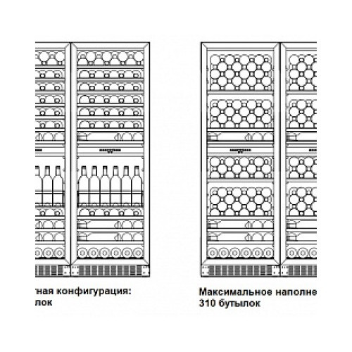 | Дополнительные особенности | Подходит для ресторана/Возможность встраивания: В колонну/Стандартная комплектация: 2 резервуара для воды/4 ключа/ярлыки для записей даты закладки вина/Индикация температуры/Индикатор открытой двери/Выдвижные ящики для хранения открытых бутылок с вином/также для размещения магнумов/хьюмидоров/шоколада/Функция памяти установленного режима охлаждения (при отключении электропитания заданный режим сохраняется)/Белая внутренняя подсветка с двух сторон/Регулировка высоты за счет выкручивания ножек до 8 см/Ручка и накладки на полках из стали/Задняя стенка винного шкафа абсолютно плоская (можно ставить вплотную к стене)/Максимальная закладка до 310 бутылок (при демонтаже нескольких полок) |