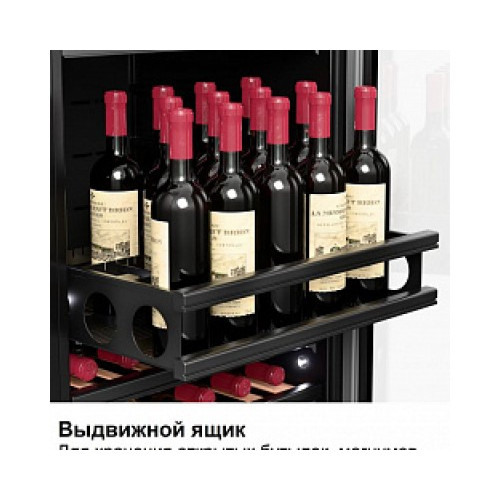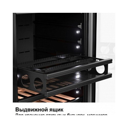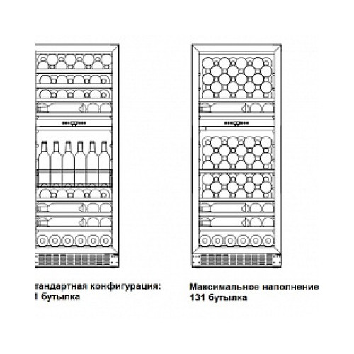 | Дополнительные особенности | Подходит для ресторана/Возможность встраивания: В колонну/Стандартная комплектация: Резервуар для воды/2 ключа/ярлыки для записей даты закладки вина/Индикация температуры/Индикатор открытой двери/Выдвижной ящик для хранения открытых бутылок с вином/также для размещения магнумов/хьюмидоров/шоколада/Функция памяти установленного режима охлаждения (при отключении электропитания заданный режим сохраняется)/Белая внутренняя подсветка с двух сторон/Регулировка высоты за счет выкручивания ножек до 8 см/Ручка и накладки на полках из стали/Задняя стенка винного шкафа абсолютно плоская (можно ставить вплотную к стене)/Максимальная закладка до 131 бутылки (при демонтаже нескольких полок) |