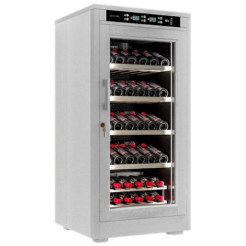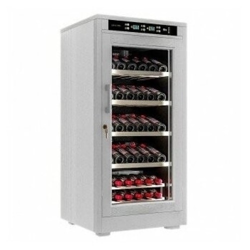 Компрессорный винный шкаф MV66-WW1-M Современный винный шкаф MV66-WW1-M – инновационное решение проблемы качественного хранения вина. Расширенная функциональность, изысканный дизайн, полноценная имитация условий «винного погреба» - всё это винный шкаф Meyvel MV66-WW1-M! Благодаря изысканному внешнему виду, данный винный шкаф становится оптимальным вариантом для установки в Вашем интерьере: деревянный короб, выполненный из Американского дуба в белом цвете отлично дополнит любое дизайнерское решение. Одним из отличий модели MV66-WW1-M от других винных шкафов данной линейки является расширенная вместимость: внутреннее пространство рассчитано на хранение до 66 бутылок типа Бордо (объем - 0, 75л). При заданных габаритах и достаточно обширном объеме внутреннего пространства, данную модель вполне можно отнести к группе компактных винных шкафов, оптимально подходящих для установки в любой функциональной зоне. Благодаря специальному алюминиевому покрытию с тиснением внутри корпуса данной модели, достигается оптимальный показатель циркуляции воздуха и равномерного охлаждения содержимого. Для максимального удобства пользователя, производитель установил интуитивно понятную систему управления в верхней части винного шкафа, с помощью которой Вы можете настроить необходимый температурный режим, а также скорректировать показатели уровня влажности. Винный шкаф Meyvel MV66-WW1-M оснащен энергоэффективным инновационным компрессором Embraco, благодаря чему работа модели становится практически бесшумной. Качественное устранение вибраций достигается за счет установленного комплекта резиновых прокладок, отличающихся высокими изоляционными показателями. Для хранения винной коллекции предназначены специальные полки из натурального бука в количестве 10 штук: нижняя (1), универсальная (7), демонстрационная (1), полка с водным резервуаром (1). Для поддержания оптимального уровня циркуляции мы настоятельно рекомендуем не размещать бутылки вплотную с компрессором и стенками винного шкафа. Для того, чтобы регулировка уровня влажности была наиболее доступной, производитель оснастил модель специальным резервуаром с водой, обеспечивающим отсутствие посторонних запахов внутри винного шкафа, а также гарантирующим поддержание заданного влажностного режима. Специальный балансировочный механизм позволит Вам установить шкаф максимально быстро и легко. Двойное полое стекло, установленное на дверцу, надежно защищает содержимое винного шкафа от попадания ультрафиолетовых лучей, а специальная светодиодная подсветка в сочетании с системой устранения запотевания, помогут Вам в эффектной демонстрации винной коллекции. Преимущества винного шкафа MV66-WW1-M: вместительность до 66 бутылок типа Бордо (0, 75л); изысканный дизайн, корпус из Американского дуба в белом цвете; равномерное охлаждение и каче