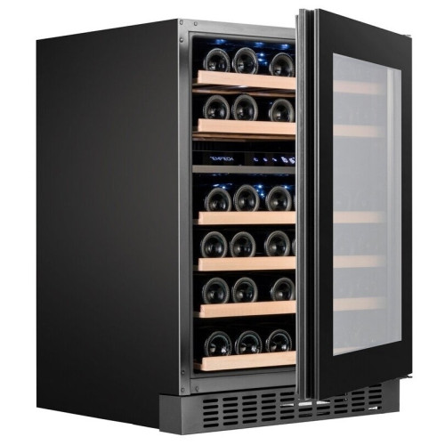 Винный шкаф с двумя температурными зонами (5-20°C, 5-20°C) и вместимостью до 46 бутылок вина. Благодаря двум температурным зонам у вас всегда есть готовое к подаче белое вино, игристое и красное вино в любое время! Стильный дизайн с черным стеклянным фасадом со встроенной ручкой, выдвижными буковыми полками и белым внутренним светодиодным освещением. С помощью сенсорной панели и цифрового дисплея вы получаете полный контроль над температурой и освещением. Благодаря стандартным размерам винный шкаф легко интегрируется в любую кухню. Винный шкаф также можно разместить отдельно, если вы пожелаете. Ваша винная коллекция надежно хранится при правильной и стабильной температуре, оптимальной влажности, низкой вибрации и чистом воздухе! Мы рекомендуем хранить белое вино и игристое при температуре 8°C, а красное-при температуре 14°C. Коллекция вин хранится надежно и надежно за стеклянной дверью, защищенной от ультрафиолетового излучения, которая защищает от вредных ультрафиолетовых лучей и тепла, которые могут проникнуть в винный шкаф. Винный шкаф оснащен вентиляторами, которые циркулируют воздух в винном шкафу, поддерживая постоянную и стабильную температуру. Конденсатная вода в винном шкафу используется повторно и поддерживает оптимальную влажность в винном шкафу. Активный угольный фильтр обеспечивает свежий и чистый воздух в винном шкафу. Количество зон: две Температурный режим: +5.+20 °C (верх. +5.+20/нижн. +5.+20) Количество бутылок: 46 шт. Условие эксплуатации: +16.+32 °C Возможность встроить: есть Хладагент: R600a (29 гр.) Охлаждение: динамическое Вид охлаждения: компрессорное Дверь: в черной раме со встроенной ручкой, стеклопакет с защитой от УФ Полки: 6 шт, деревянных, выдвижных Подсветка: есть, LED (белая) Объем: 145 л. Внутренняя влажность: 30-60 % (ванночка с водой, в комплекте нет) Потребляемая мощность: 110 Вт Энергопотребление в сутки: 0,290 кВт Энергетический класс: F (по таблице классов с 2021г) Номинальное напряжение: 220 В, 50 Гц Корпус: черный, металлический Разморозка: автоматическая Угольный фильтр: есть Зимний режим: нет Перевеска двери: есть Замок: нет Управление: сенсорное Уровень шума: 39 дБ Размеры (ШхГхВ): 595х570х813 мм Масса (без упк./в упк.): 46/50 кг Размеры ниши (ШхГхВ): 605х590х820 мм Размер в упаковке (ШхГхВ): 660х625х880 мм