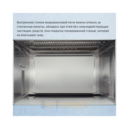 - Вместительная камера 25 литров: Объема достаточно для приготовления блюд в большой тарелке или разогрева сразу нескольких порций. Внутреннее покрытие EasyClean с округлыми углами упрощает уход — любые брызги легко удаляются.