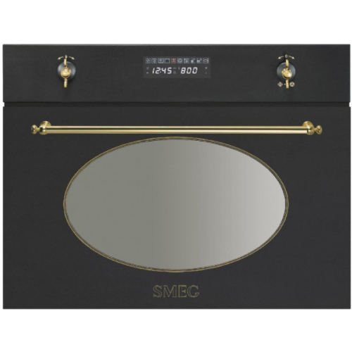 Smeg SC 845 MA Оснащение: Исполнение: Антрацит / Фурнитура позолоченная LЕD-дисплей Поворотные переключатели 4 функции приготовления Дополнительные функции: размораживание по времени, размораживание по весу Электронный программатор: таймер, отсрочка включения, автоматическое выключение Акустический сигнал окончания приготовления Режим SHOWROOM Опция ECOlogic – ограничение мощности Полезный объем 34 л Поворотный стол Ø32 см 3 уровня приготовления Металлические направляющие Внутренняя камера из нержавеющей стали Внутреннее освещение – 1 лампа накаливания Освещение при открытой дверце Безопасность: Тангенциальная система охлаждения Блокировка управления от детей Автоматическое отключение при открытой дверце В комплекте: Противень стеклянный: 1 Решетка: 1 Характеристики: Габариты: 455 х 595 х 540 мм Номинальная мощность: 3,4 кВт Мощность гриля: 1,5 кВт Мощность микроволн: 1000 Вт Напряжение: 220-240 Вт Частота тока: 50/60 Гц Бренд: Smeg Модель: SC 845 MA