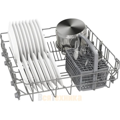 - Гибкость загрузки VarioFlex: В комплекте идут три корзины: верхняя для столовых приборов, средняя для чашек и стаканов, нижняя для крупных предметов. Корзины можно регулировать или убирать, чтобы освободить место для высоких кастрюль или противней.