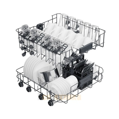 Встраиваемая посудомоечная машина шириной 60 см HDWE14-592RU рассчитана на загрузку до 14 стандартных комплектов посуды, такая большая вместимость поможет помыть за один цикл всю посуду практически в любой жизненной ситуации, причем в нижней и средней корзине есть складные держатели для тарелок. В нижней корзине есть складные держатели для тарелок, а верхнюю корзину можно отрегулировать по высоте, чтобы максимально удобно загрузить всю посуду. Важная особенность этой модели — автоматическое открывание двери в конце программы мойки. Так посуда высохнет более быстро и качественно без дополнительного расхода электроэнергии.