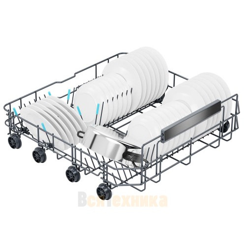 Высокотехнологичный инверторный мотор способствует более тихой и долговечной работе посудомоечной машины. В нижней и средней корзине есть складные держатели, а среднюю корзину можно также отрегулировать по высоте, чтобы максимально удобно загрузить всю посуду.
