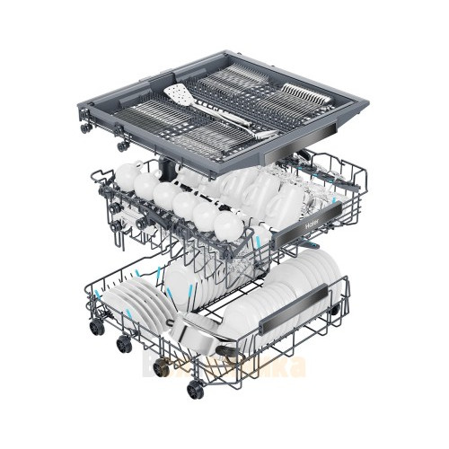 Имеет стандартные размеры, поэтому может не поместиться на очень маленькой кухне. В камеру можно загрузить ограниченное число комплектов: 16 шт. Комплектом считается набор посуды на одного человека, который нужен для полноценного приема пищи: глубокая и плоская тарелки, тарелка для салата, блюдце под чашку, сама чашка, ложка и вилка.