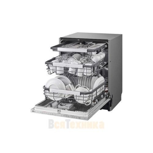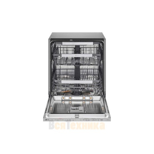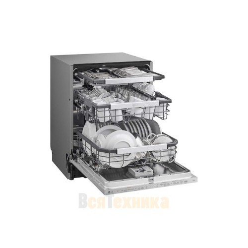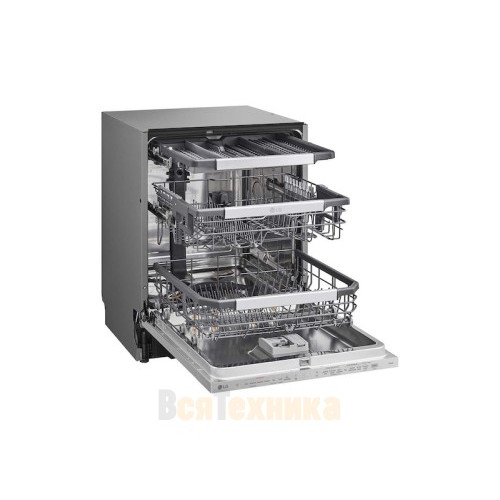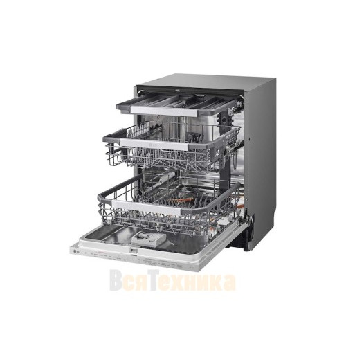 - Интеллектуальная система LG QuadWash: Четыре коромысла (два верхних и два нижних), включая специальное верхнее для мытья противней, обеспечивают всестороннее орошение даже в самых сложных зонах: углах, глубоких кастрюлях и плотно заставленной посудой.