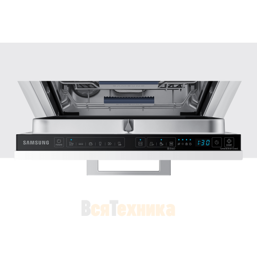 - Отличная вместимость до 10 комплектов посуды: Несмотря на узкий корпус, инженерам Samsung удалось рационально организовать внутреннее пространство. Вмещает до 10 стандартных наборов посуды, что достаточно для семьи из 3-4 человек.