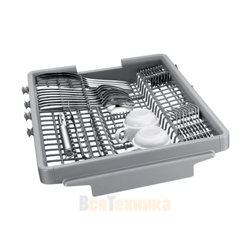 Верхняя корзина регулируется по высоте, что позволяет разместить на нижнем уровне высокие предметы: кастрюли, высокие бокалы, сотейники. Специальные складные держатели для тарелок и отсеки для столовых приборов помогают оптимально использовать каждый сантиметр пространства. Отдельный лоток для столовых приборов в верхней корзине освобождает место внизу для крупных предметов.