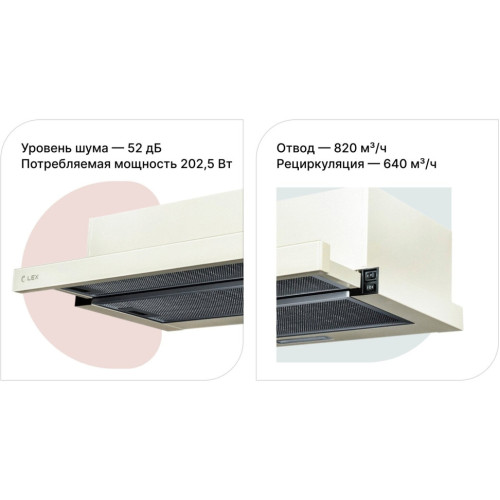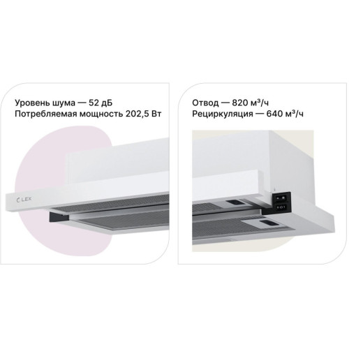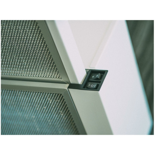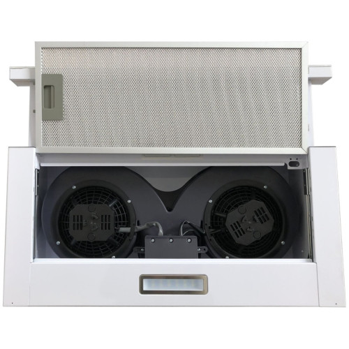 Основным преимуществам встраиваемой вытяжки из серии Hubble G 2M является наличие двух моторов. Благодаря им производительность прибора увеличивается до 1000 м?/час. Вытяжное устройство можно установить в достаточно просторной кухне и даже в квартире-студии. Несмотря на высокую производительность и конструктивные особенности, габариты вытяжки остаются компактными: ширина корпуса 60 см, а высота всего 17,6 см. Модель устанавливается в подвесной кухонный шкаф, внутри которого еще останется место для хранения кухонных мелочей. Белая вытяжка с передней панелью, отделанной стеклом, будет уместна в любом интерьере. В вытяжном устройстве предусмотрена двухпозиционная регулировка скорости вращения вентилятора. Управление осуществляется при помощи механического кнопочного переключателя. Вы можете использовать режимы отвода или рециркуляции в зависимости от личных предпочтений и состояния системы вентиляции в вашей квартире. Для работы на отвод воздуха вытяжка должна быть оборудована воздуховодом. Режим рециркуляционной очистки требует установки угольных фильтров в дополнение к жироулавливающим, предусмотренным в стандартной комплектации. Если вам нужна очень тихая вытяжка, рекомендуется выбрать встраиваемую модель. Уровень шума прибора при работе на второй скорости 52 дБ, а на первой всего 42 дБ. Стенки подвесного шкафа обеспечивают дополнительную шумоизоляцию.