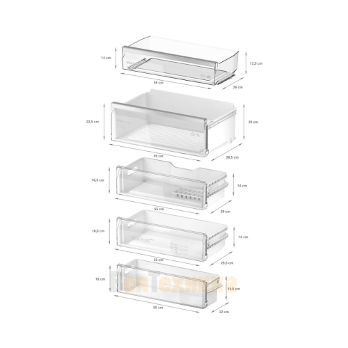 - Большие выдвижные ящики в морозильной камере: Четыре вместительных контейнера позволяют систематизировать заморозку. Каждый ящик плавно выдвигается на шасси даже при полной загрузке.