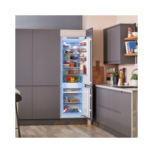 - Полное встраивание без видимых зазоров: Модель монтируется в нишу кухонного гарнитура, создавая единую стильную поверхность. Дверца холодильника крепится на фасад мебели, что позволяет сохранить общий дизайн кухни.
