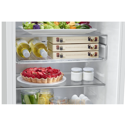 - Вместительная холодильная камера: Пространство организовано с помощью регулируемых полок из закаленного стекла, выдерживающих большой вес. Дверные полки-контейнеры имеют специальные ограничители для бутылок.