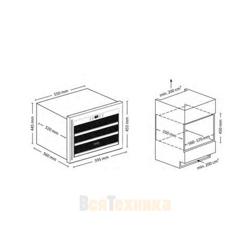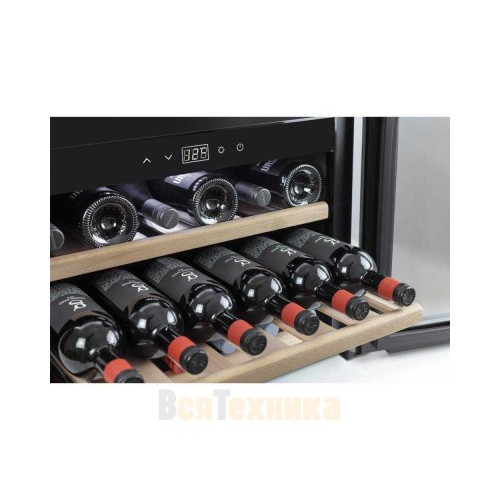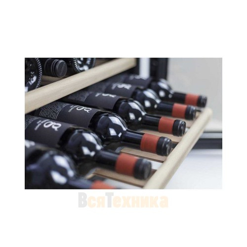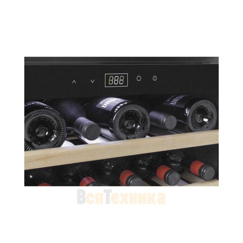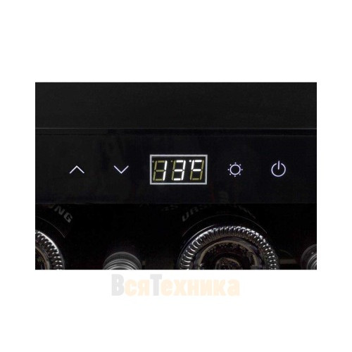 Три съемных полки из дерева предназначены для правильного хранения вина: бутылки кладутся горизонтально (вместительность – 18 бутылок), чтобы пробки не рассыхались, и внутрь бутылки не попадал кислород. Управление осуществляется при помощи сенсорного дисплея внутри холодильника. Регулировка температурных показателей с шагом в 1°C происходит нажатием « ∧ » и «∨». Управление внутренним освещением возможно при помощи кнопки «Свет».