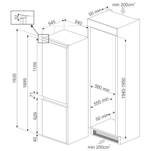 Основные характеристики Тип: холодильник с морозильной камерой Тип установки: встраиваемый Тип компрессора: инверторный Количество компрессоров: 1 Количество камер: 2 Общий полезный объем: 284 л Холодильная камера Объем холодильной камеры: 196 л Регулировка температуры в холодильной камере: да Размораживания холодильной камеры: No Frost Количество отделений в холодильной камере: 1 Морозильная камера Объем морозильной камеры: 69 л Расположение морозильной камеры: снизу Размораживание морозильной камеры: No Frost Мощность замораживания: 3.5 кг/сутки Хранение продуктов при отключении питания: 13 ч Регулировка температуры в морозильной камере: да Зона свежести Зона свежести: да Объем зоны свежести: 19 л Управление Тип управления: сенсорное Способ управления: сенсорный Расположение панели управления: на корпусе Дисплей Дисплей: да Вид дисплея: цифровой, символьный Тип дисплея: LED Индикация Индикация температуры морозильной камеры: да Индикация повышения температуры: звуковая Индикация открытой двери: звуковая Индикация температуры холодильной камеры: да Электропитание Класс энергопотребления: A++ Энергопотребление: 262 кВтч/год Напряжение: 220-240 B Мощность подключения: 125 Вт Режим энергосбережения: да Климатические класс: SN-N-ST-T Уровень шума: 37 дБ Защита и безопасность Тип сигнализации: акустический Сигнализация об открытой двери: да Сигнализация о повышении температуры: да Освещение Освещение холодильной камеры: да Тип освещения: светодиодное (LED) Функции и возможности Суперзаморозка: да Независимая регулировка температуры в камерах: да Суперохлаждение: да Режим «Отпуск»: да Дополнительная информация: MultiFlow Особенности конструкции Количество дверей: 2 Открытие дверцы: направо Перенавешиваемые двери: да Крепления фасада: скользящие направляющие Встроенный вентилятор для распределения температуры: да Контейнеры и полки Количество полок в холодильной камере: 4 Регулируемые по высоте полки в холодильной камере: 4 Количество полок на дверце холодильной камеры: 4 Количество контейнеров в холодильной камере: 1 Количество контейнеров в морозильной камере: 3 Количество контейнеров в зоне свежести: 1 Подставка для яиц: да Цвет и материал Цвет полок: прозрачный Цвет ящиков: прозрачный Материал полок: стекло Материал ящиков: пластик Комплектация Формочки для льда: да Количество формочек для льда: 1 Подставка для .