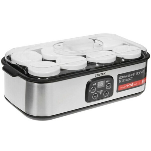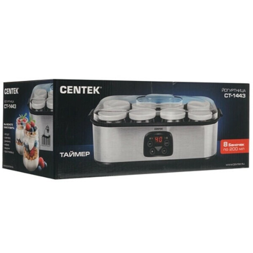 Йогуртница Centek CT-1443 обладает мощностью в 30 Вт. Электронное управление очень удобное. Есть таймер. Доступно 8 баночек по 200 мл. Вы можете приготовить йогурт, сметану, ряженку, кефир, мацони, протоквашу.